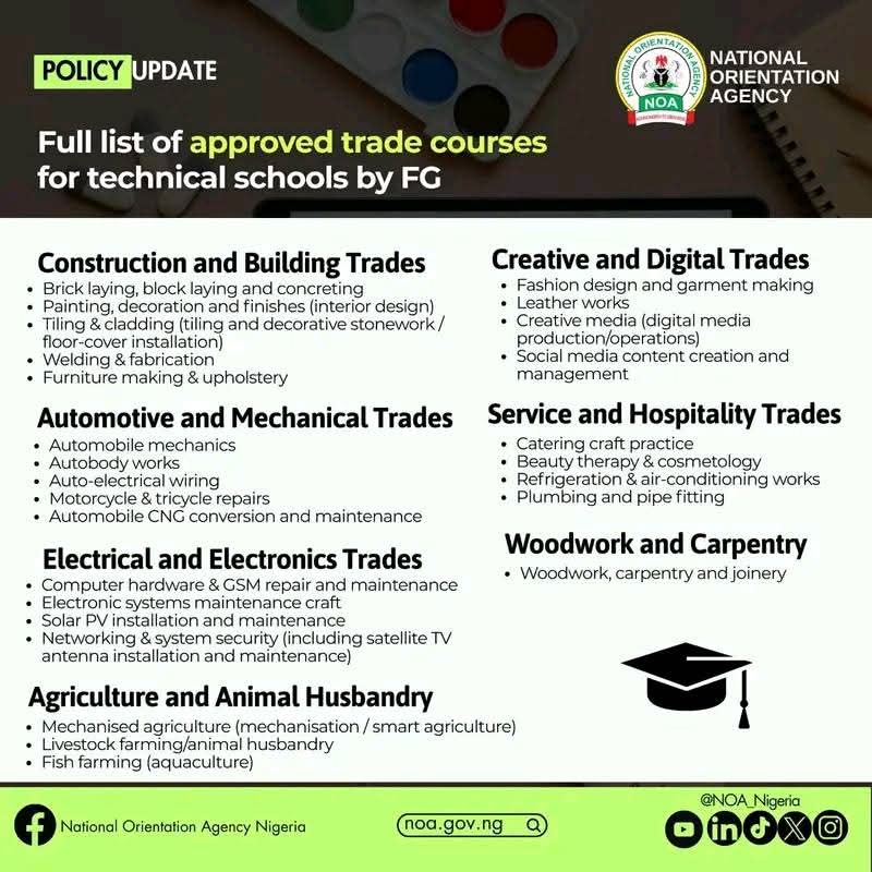 The new curriculum will, over time, address the shortage of technical skills in critical sectors such as construction, energy, agriculture, automotive, creative media and digital services as students will be trained in brick laying, block laying and concreting, woodwork, carpentry and joinery and plumbing and pipe fitting. Other subjects available include computer hardware & GSM repair and maintenance, refrigeration & air-conditioning works, mechanisation and smart agriculture, autobody works, catering craft practice, among others.