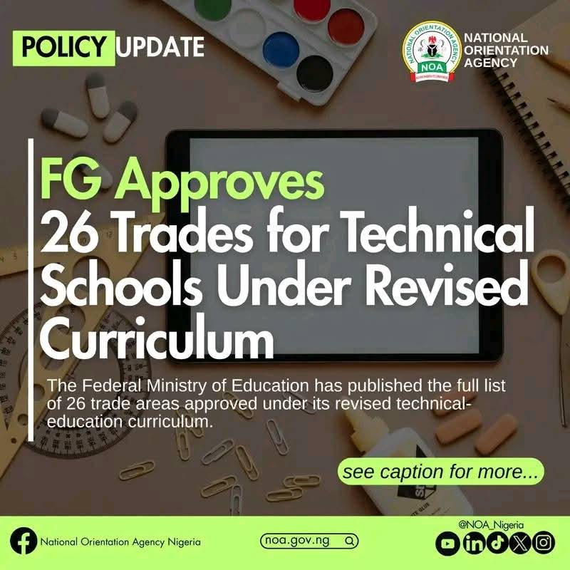 In a move to boost technical education and equip students with relevant vocational skills, the federal government has approved 26 trade subjects for implementation in technical colleges across the country under a newly revised curriculum.