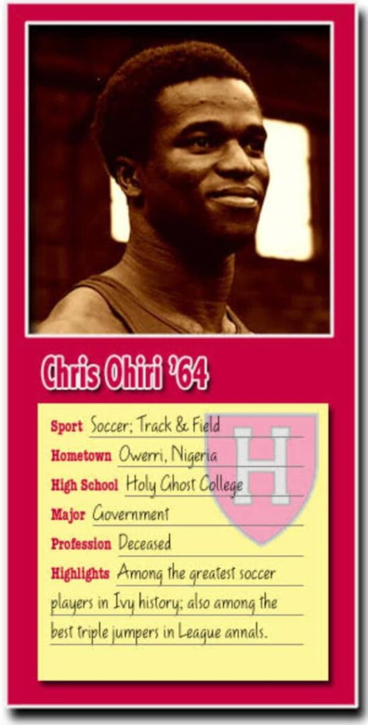 Ohiri was a multi-sport star. In Nigeria, he was a national champion in boxing and the decathlon, showcasing his versatility early on. He represented Nigeria internationally, scoring two goals in the soccer qualifiers for the 1960 Rome Olympics, though the team didn’t advance to the finals. At the 1964 Tokyo Olympics, he competed in the men’s triple jump, finishing 24th. At Harvard, Ohiri dominated soccer, setting school and Ivy League records with 47 career goals (a mark that stood for decades and is now tied), including records for goals in a game, season, and career.