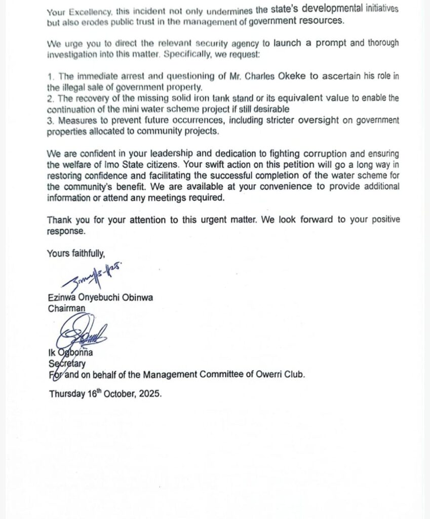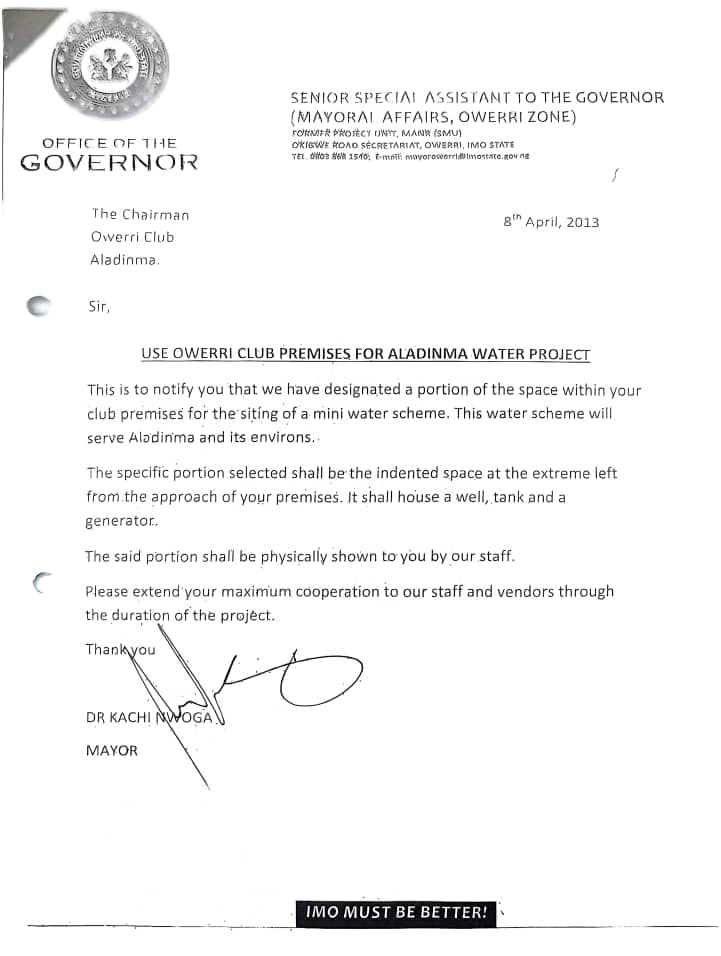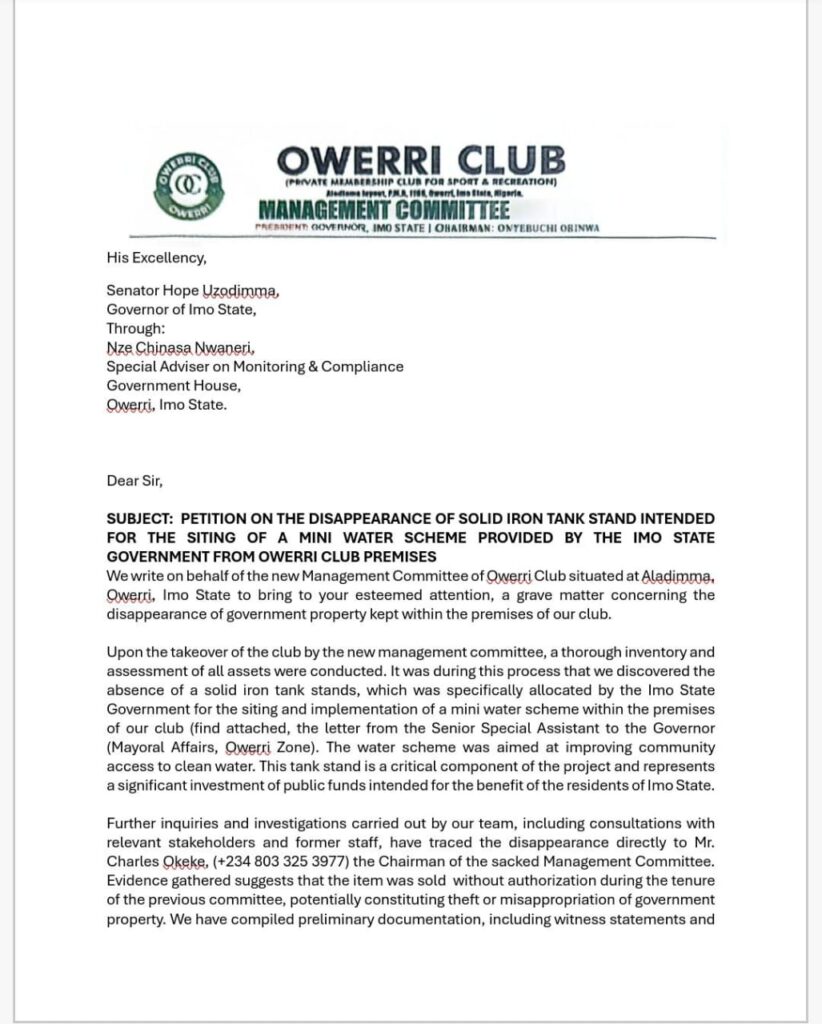 Upon the takeover of the club by the new management committee, a thorough inventory and assessment of all assets were conducted. It was during this process that we discovered the absence of a solid iron tank stands, which was specifically allocated by the Imo State Government for the siting and implementation of a mini water scheme within the premises of our club (find attached, the letter from the Senior Special Assistant to the Governor (Mayoral Affairs, Owerri Zone). The water scheme was aimed at improving community access to clean water. This tank stand is a critical component of the project and represents a significant investment of public funds intended for the benefit of the residents of Imo State.